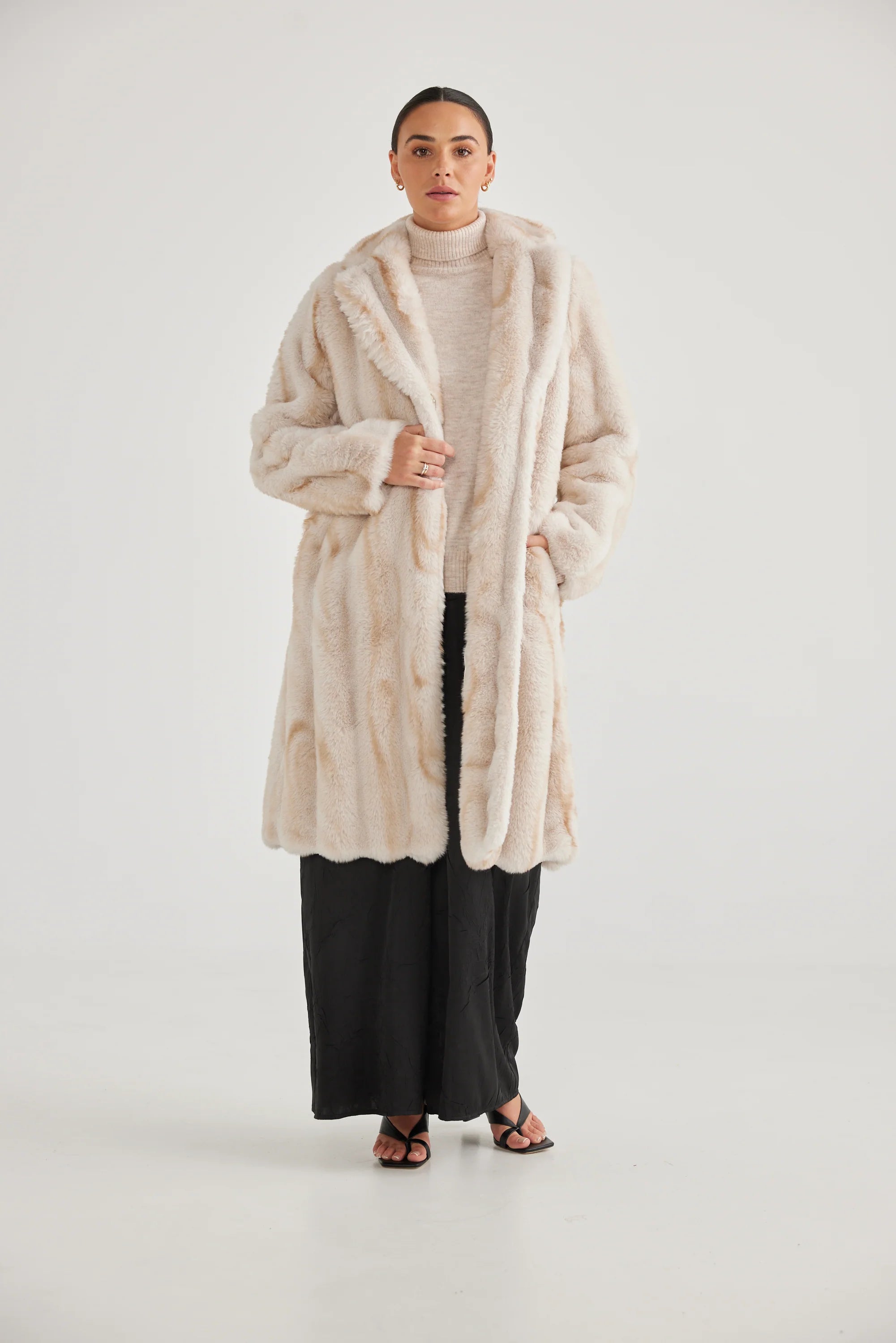 Look sexy and stylish with the new Nolita Jacket! This super cosy, faux fur piece will have you looking chic and sophisticated! With a hook button closer, you know you'll stay toasty warm in this dreamy vanilla linear creation! So get ready for some serious warmth and enviable style!