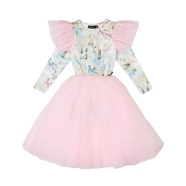 The Fairy Tales Flounce Dress will be the perfect addition to your mini's wardrobe. This dress is so magical with its gorgeous pastel colour pallette and print of castles, dragons and unicorns! The tulle shoulder and skirt just adds to the...